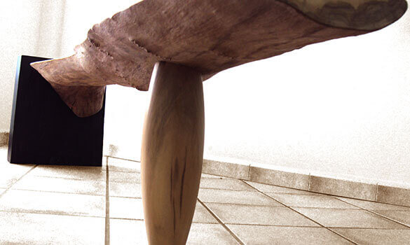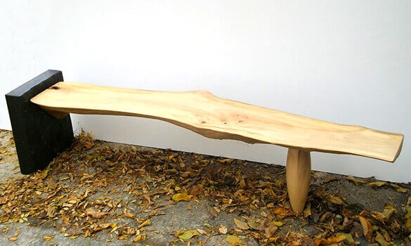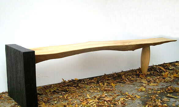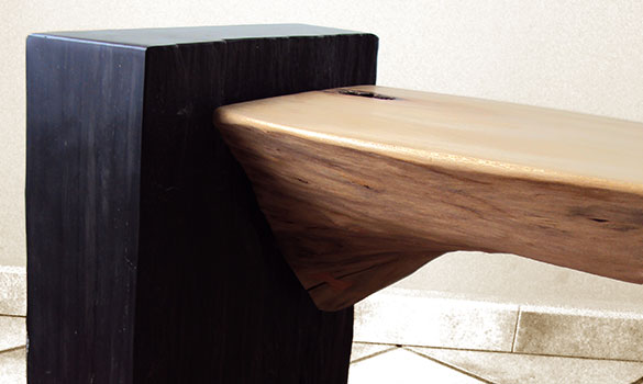 Eine Sitzbank, deren Design geprägt ist von den Material- und Farbkontrasten eines naturbelassenen Baustamms und schwarzem Naturstein. Minimalismus, gepaart mit japanischer Kunst der ästhetischen Wahrnehmung: Wabi Sabi